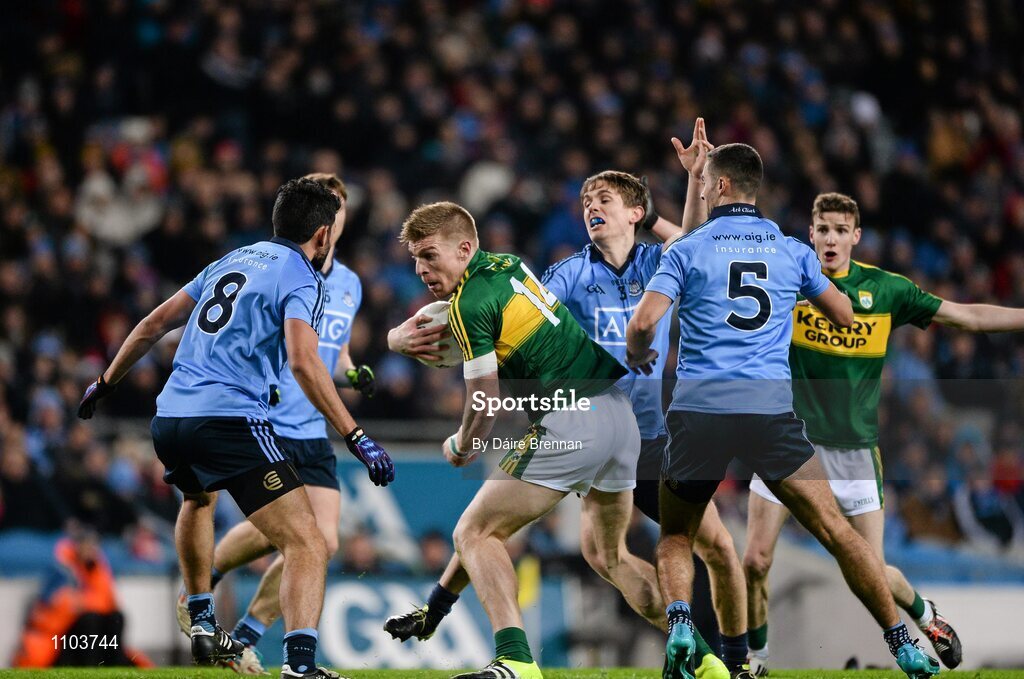 30 January 2016; Tommy Walsh, Kerry, in action against Dublin players, left to right, Cian O'SullEvan, John Small, Michael Fitzsimons, and James McCarthy. Allianz Football League, Division 1, Round 1, Dublin v Kerry, Croke Park, Dublin. Picture credit: Dáire Brennan / SPORTSFILE