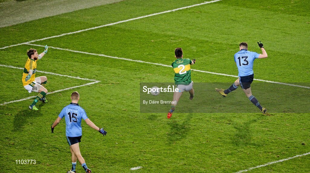 30 January 2016; Paddy Andrews, Dublin, scores his side's first goal past Kerry goalkeeper Brendan Kealy. Allianz Football League, Division 1, Round 1, Dublin v Kerry, Croke Park, Dublin. Picture credit: Dáire Brennan / SPORTSFILE