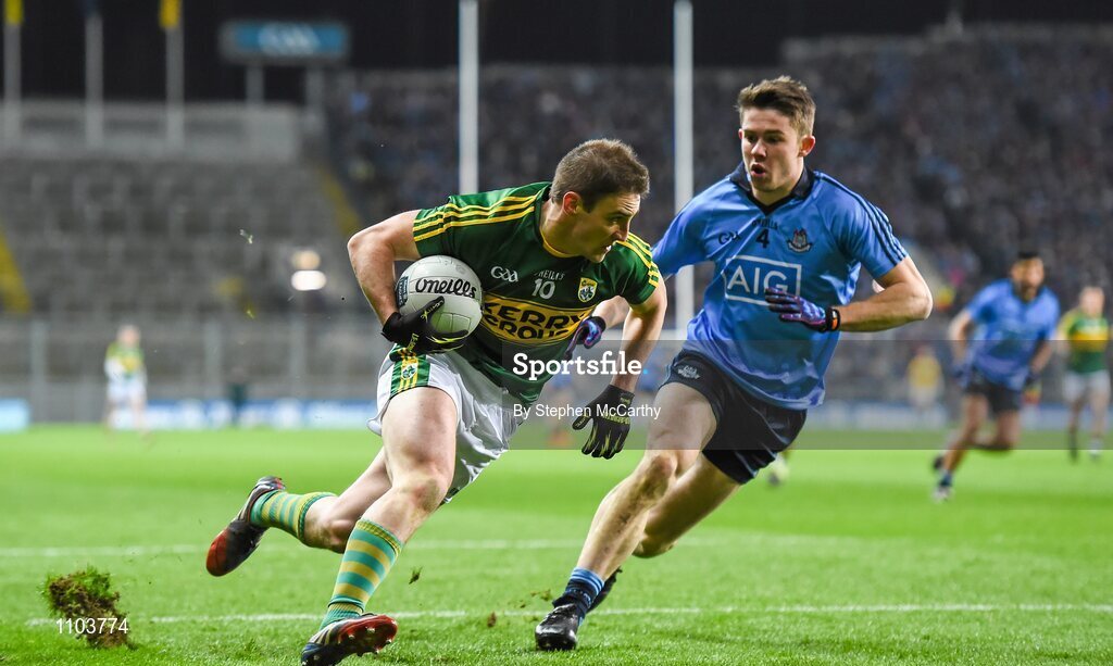 30 January 2016; Stephen O’Brien, Kerry, in action against David Byrne, Dublin. Allianz Football League, Division 1, Round 1, Dublin v Kerry. Croke Park, Dublin. Picture credit: Stephen McCarthy / SPORTSFILE