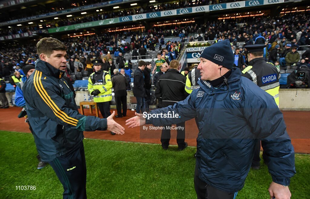 30 January 2016; Kerry manager Eamonn Fitzmaurice, left, and Dublin manager Jim Gavin shake hands after the game. Allianz Football League, Division 1, Round 1, Dublin v Kerry. Croke Park, Dublin. Picture credit: Stephen McCarthy / SPORTSFILE