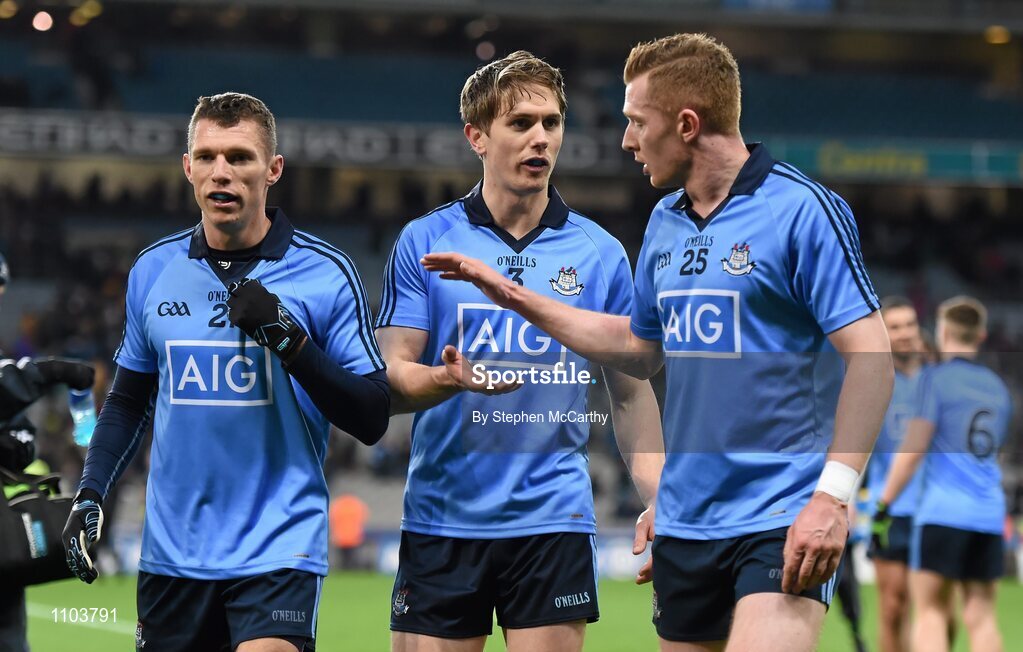 30 January 2016; Dublin players, from left, Darren Daly, Michael Fitzsimons and Ciaran Reddin following their victory. Allianz Football League, Division 1, Round 1, Dublin v Kerry. Croke Park, Dublin. Picture credit: Stephen McCarthy / SPORTSFILE