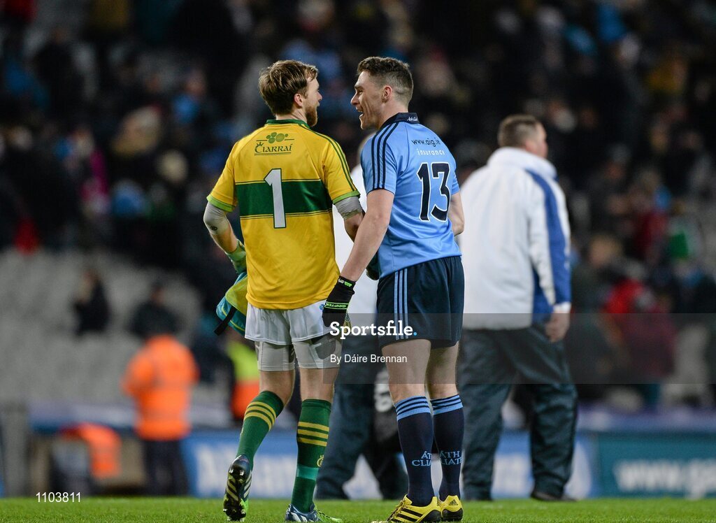 30 January 2016; Paddy Andrews, Dublin, shakes hands with Brendan Kealy, Kerry, after the game. Allianz Football League, Division 1, Round 1, Dublin v Kerry, Croke Park, Dublin. Picture credit: Dáire Brennan / SPORTSFILE