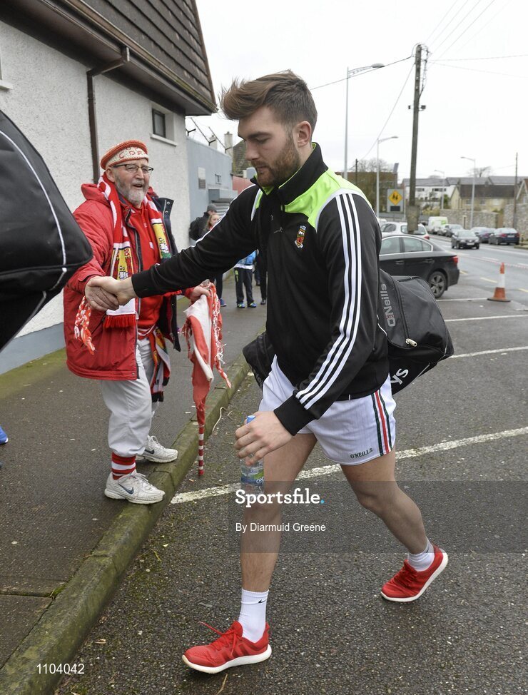 31 January 2016; Mayo's Aidan O'Shea exchanges a handshake with Cork supporter Joe Cole, from Charleville, Co. Cork as he arrives for the game. Allianz Football League, Division 1, Round 1, Cork v Mayo. Páirc Ui Rinn, Cork. Picture credit: Diarmuid Greene / SPORTSFILE