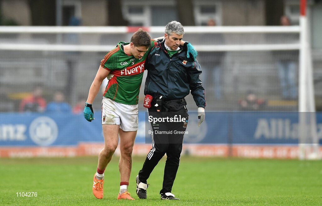 31 January 2016; Lee Keegan, Mayo, is assisted off the pitch by Dr Sean Moffatt after picking up an injury. Allianz Football League, Division 1, Round 1, Cork v Mayo. Páirc Ui Rinn, Cork. Picture credit: Diarmuid Greene / SPORTSFILE