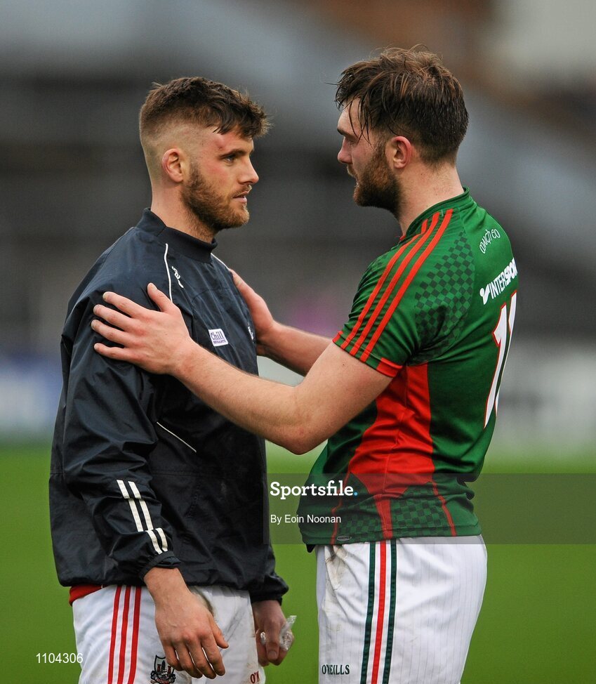 31 January 2016; Alan Cadogan, Cork, speaks with Aidan O'Shea, Mayo, after the game. Allianz Football League, Division 1, Round 1, Cork v Mayo, Páirc Ui Rinn, Cork. Picture credit: Eoin Noonan / SPORTSFILE