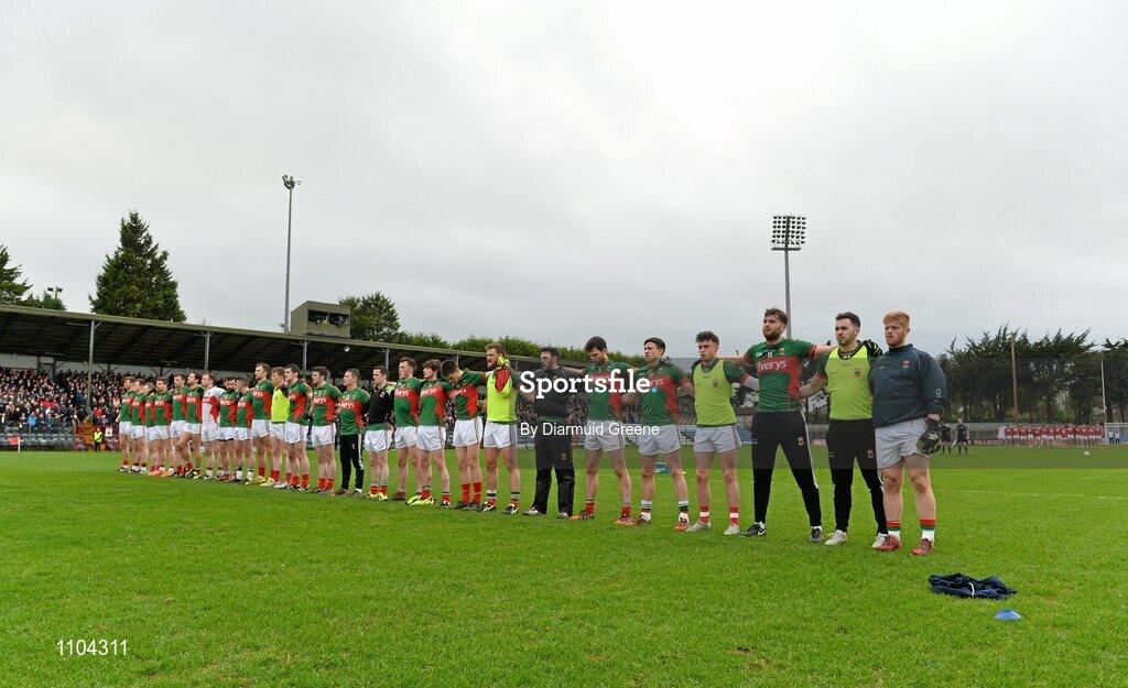 31 January 2016; The Mayo and Cork teams stand together during the playing of the national anthem before the game. Allianz Football League, Division 1, Round 1, Cork v Mayo. Páirc Ui Rinn, Cork. Picture credit: Diarmuid Greene / SPORTSFILE