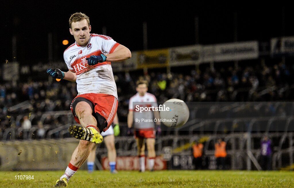 6 February 2016; Ryan Bell, Derry, takes a first half penalty that was saved by Cavan goalkeeper Raymond Galligan. Allianz Football League, Division 2, Round 2, Cavan v Derry. Kingspan Breffni Park, Cavan. Picture credit: Piaras Ó Mídheach / SPORTSFILE
