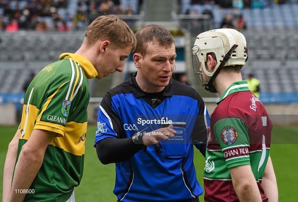 7 February 2016; Referee James Clarke speaks to the two captains, Anton Rafferty, Eoghan Rua, and Philip Roche, Glenmore, before the game. AIB GAA Hurling All-Ireland Junior Club Championship Final, Eoghan Rua v Glenmore. Croke Park, Dublin. Picture credit: Ray McManus / SPORTSFILE