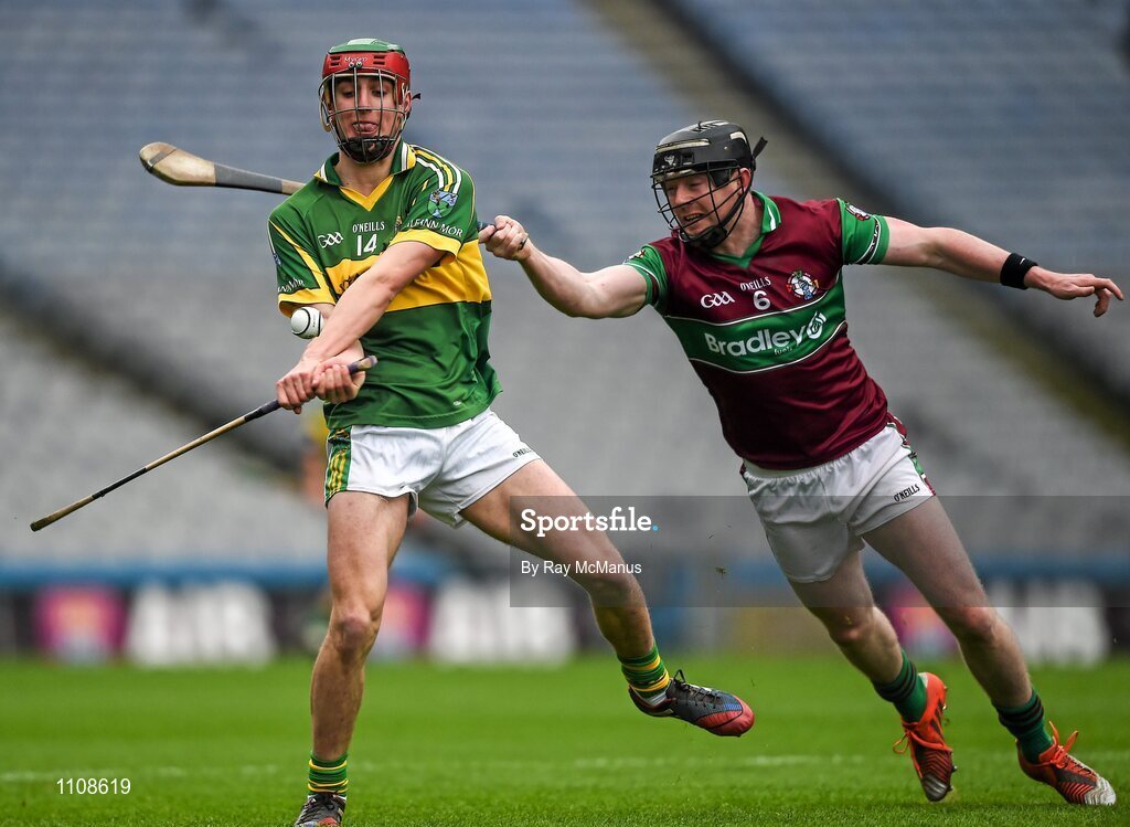 7 February 2016; Alan Murphy, Glenmore, in action against Barry McGoldrick, Eoghan Rua .AIB GAA Hurling All-Ireland Junior Club Championship Final, Eoghan Rua v Glenmore. Croke Park, Dublin. Picture credit: Ray McManus / SPORTSFILE