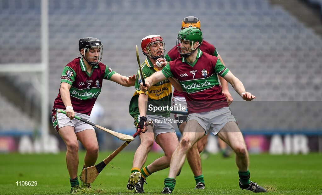 7 February 2016; James Cody, Glenmore, in action against Pearse Dallas, Ruaidhrí Leonard and Niall Holly, Eoghan Rua .AIB GAA Hurling All-Ireland Junior Club Championship Final, Eoghan Rua v Glenmore. Croke Park, Dublin. Picture credit: Ray McManus / SPORTSFILE