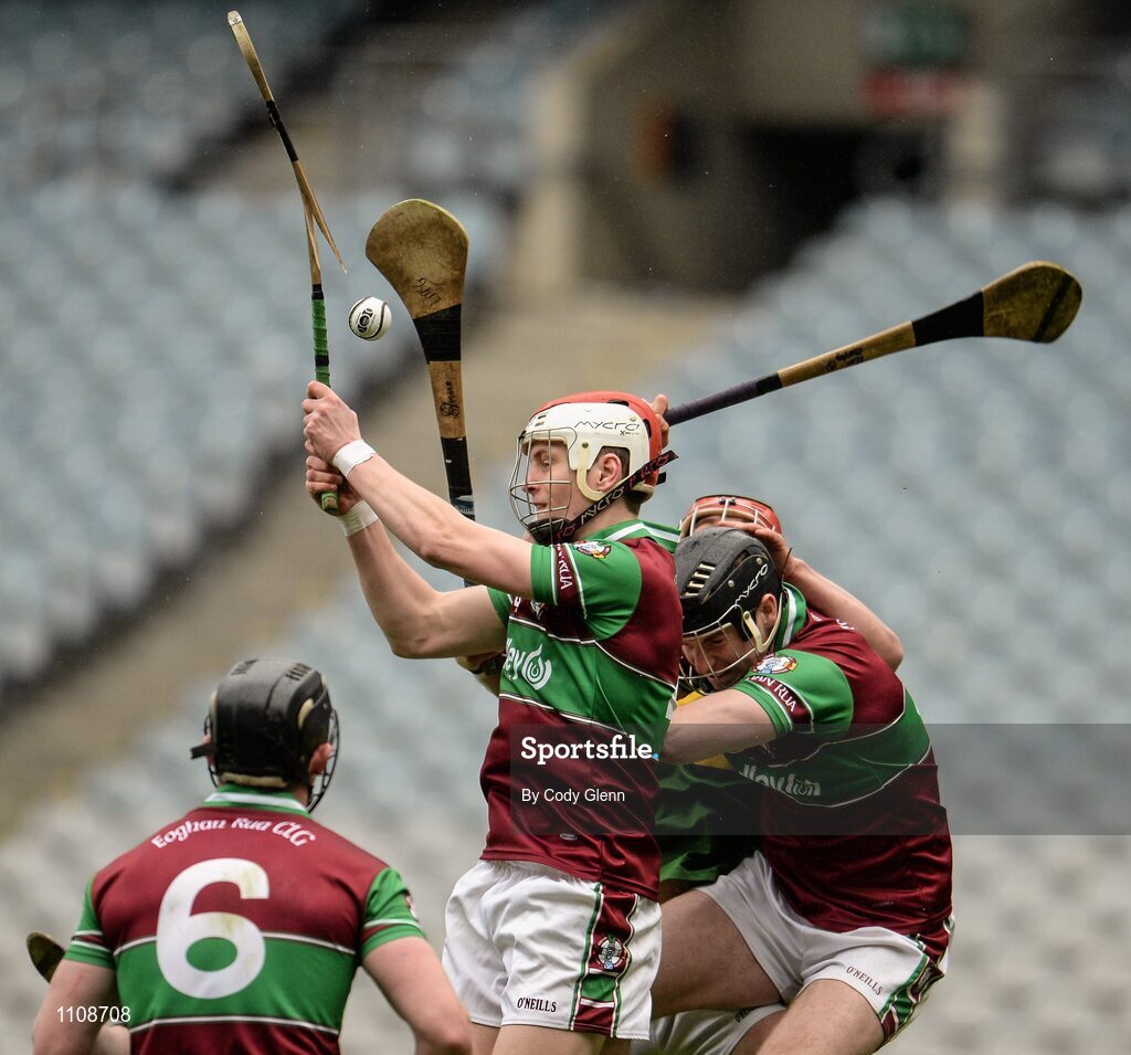 7 February 2016; Ciarán Lagan, Eoghan Rua, breaks his hurley in defence. AIB GAA Hurling All-Ireland Junior Club Championship Final, Eoghan Rua v Glenmore. Croke Park, Dublin. Picture credit: Cody Glenn / SPORTSFILE