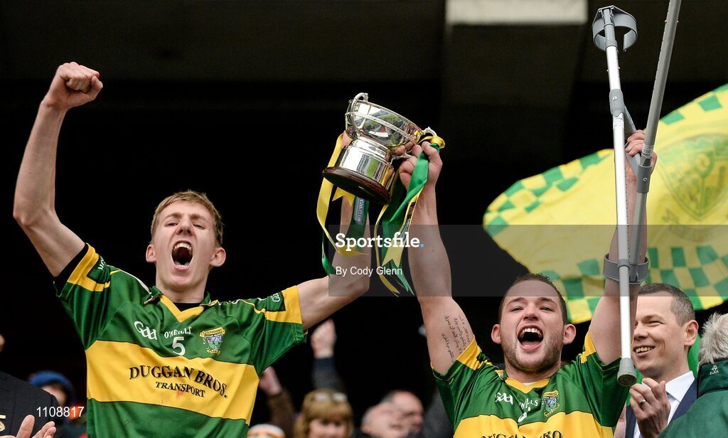7 February 2016; Philip Roche, left, and Ger Aylward, Glenmore, lift the cup. AIB GAA Hurling All-Ireland Junior Club Championship Final, Eoghan Rua v Glenmore. Croke Park, Dublin. Picture credit: Cody Glenn / SPORTSFILE