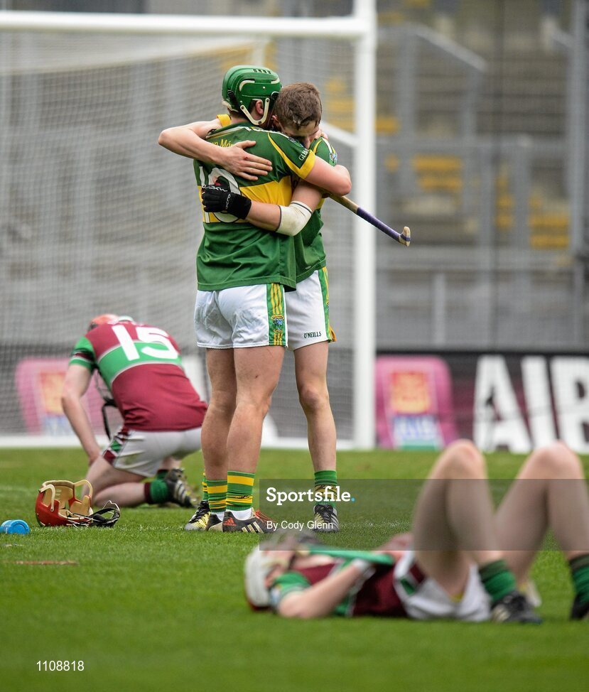 7 February 2016; Brothers, Shane, right, and Eoin Murphy, Glenmore, celebrate at the final whistle as Tommy Farragher, foreground and Fionnan Garvey, Eoghan Rua, react to the defeat. AIB GAA Hurling All-Ireland Junior Club Championship Final, Eoghan Rua v Glenmore. Croke Park, Dublin. Picture credit: Cody Glenn / SPORTSFILE