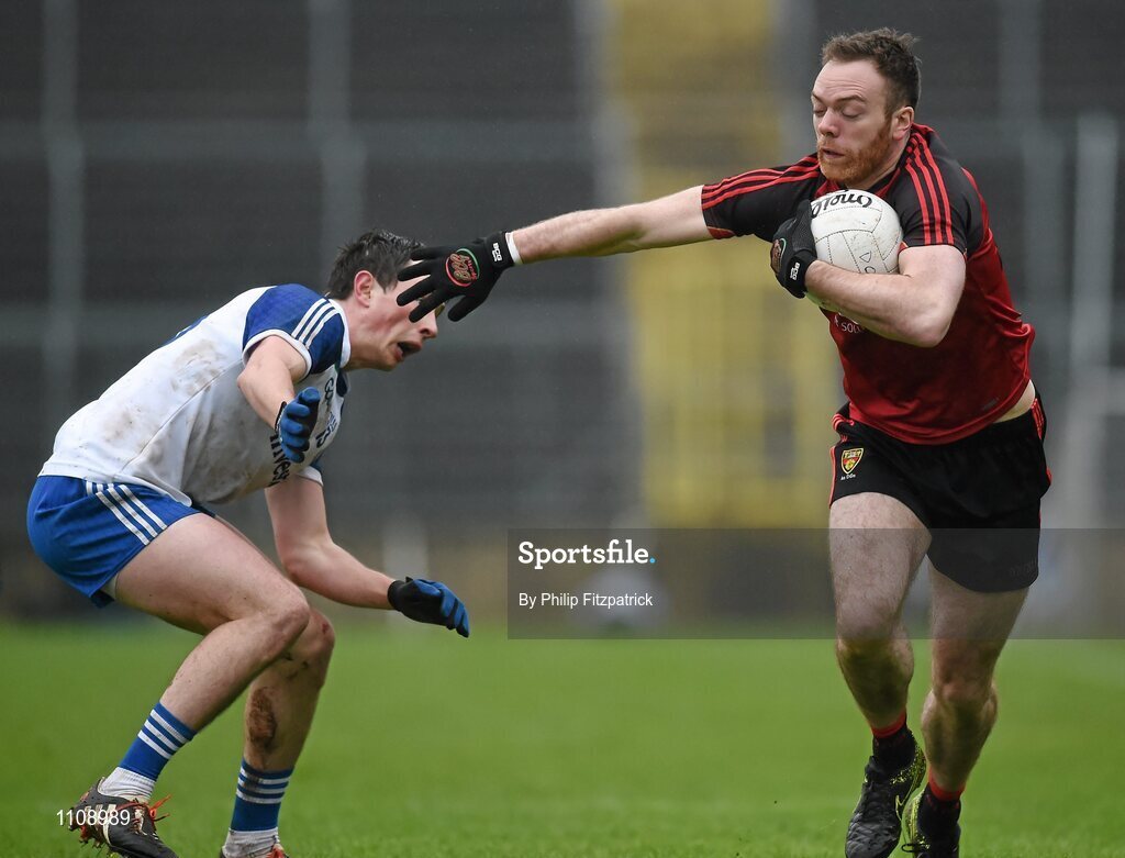 7 February 2016; Ryan Mallon, Down, in action against Shane Carey, Monaghan. Allianz Football League, Division 1, Round 2, Monaghan v Down. St Tiernach's Park, Clones, Co. Monaghan. Picture credit; Philip Fitzpatrick / SPORTSFILE