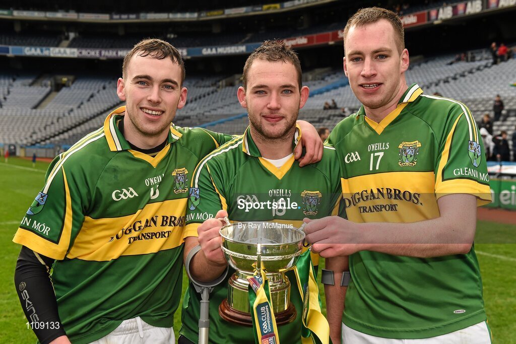 7 February 2016; Brothers Mark, left, Ger and Darren Aylard, right, celebrate with the cup after the game. AIB GAA Hurling All-Ireland Junior Club Championship Final, Eoghan Rua v Glenmore. Croke Park, Dublin. Picture credit: Ray McManus / SPORTSFILE