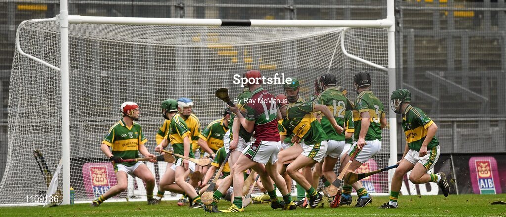 7 February 2016; Eleven Eoghan Rua players combine to stop this last second shot by Colm McGoldrick, Glenmore, in the last seconds of the game. AIB GAA Hurling All-Ireland Junior Club Championship Final, Eoghan Rua v Glenmore. Croke Park, Dublin. Picture credit: Ray McManus / SPORTSFILE