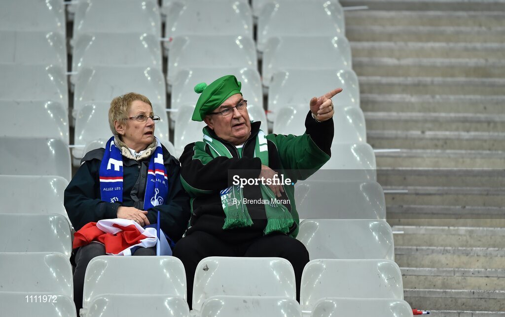 13 February 2016; An Irish and French supporter take their seats in the stadium ahead of the game. RBS Six Nations Rugby Championship, France v Ireland. Stade de France, Saint Denis, Paris, France. Picture credit: Brendan Moran / SPORTSFILE