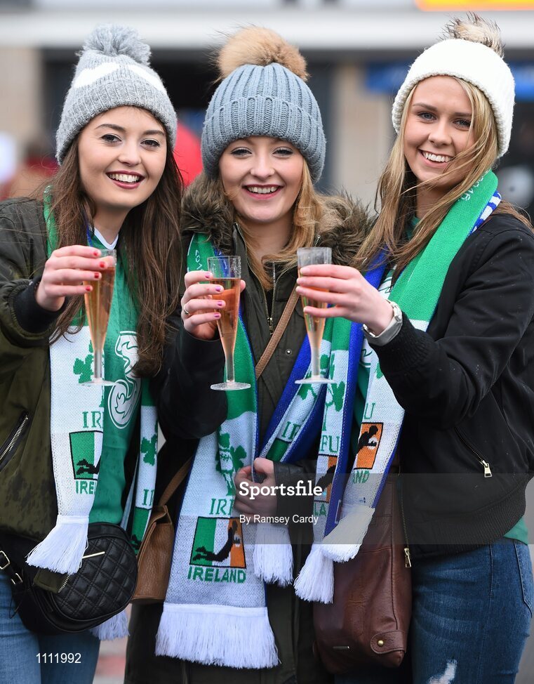 13 February 2016; Ireland supporters, from left, Ciara Garvin, Mollie O'Reilly and Lorraine Claffey, from Westmeath, at the Stade de France. RBS Six Nations Rugby Championship, France v Ireland. Stade de France, Saint Denis, Paris, France. Picture credit: Ramsey Cardy / SPORTSFILE