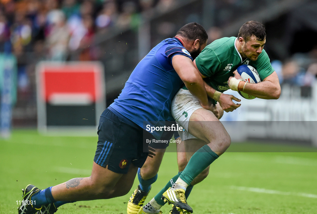 13 February 2016; Robbie Henshaw, Ireland, is tackled by Uini Atonio, France. RBS Six Nations Rugby Championship, France v Ireland. Stade de France, Saint Denis, Paris, France. Picture credit: Ramsey Cardy / SPORTSFILE