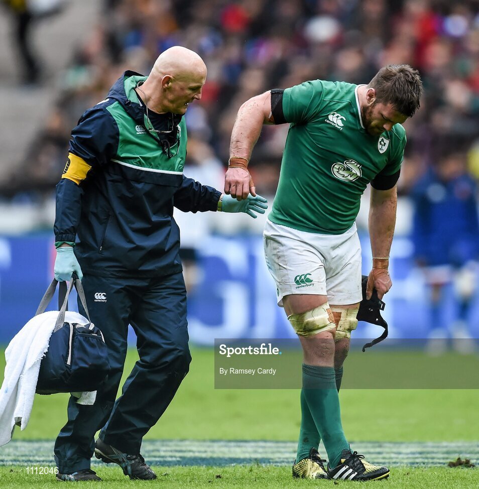 13 February 2016; Sean O'Brien, leaves the field with team doctor Dr. Jim McShane after picking up an injury. RBS Six Nations Rugby Championship, France v Ireland. Stade de France, Saint Denis, Paris, France. Picture credit: Ramsey Cardy / SPORTSFILE