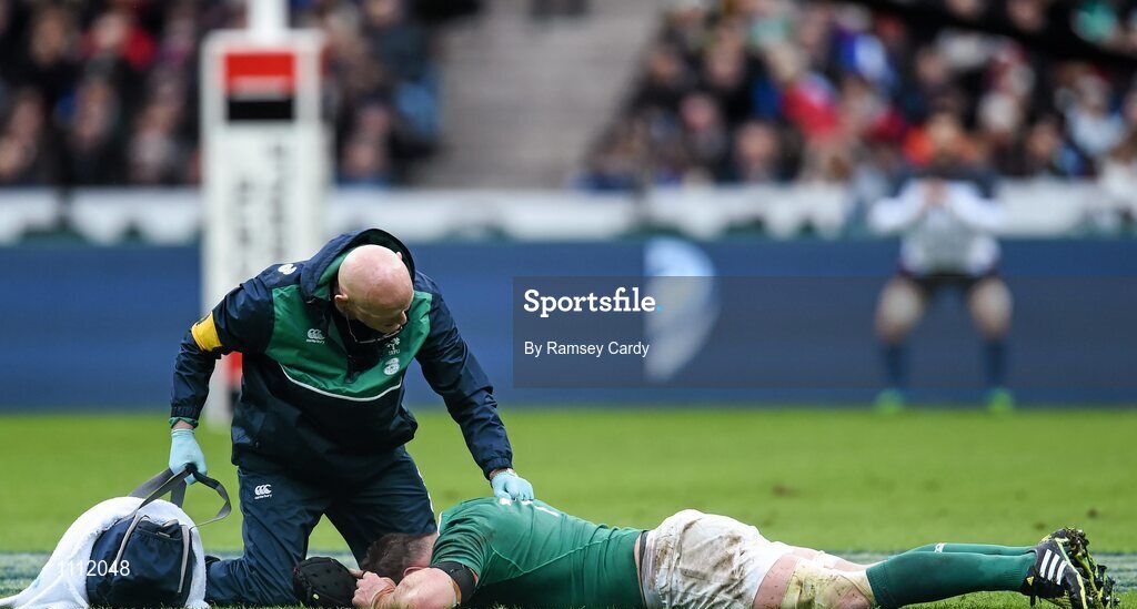 13 February 2016; Sean O'Brien, Ireland, receives treatment from team doctor Dr. Jim McShane after picking up an injury. RBS Six Nations Rugby Championship, France v Ireland. Stade de France, Saint Denis, Paris, France. Picture credit: Ramsey Cardy / SPORTSFILE