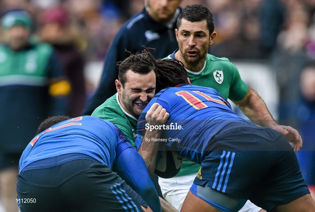 13 February 2016; Dave Kearney, Ireland, is tackled by Johnathan Danty, left, and Teddy Thomas, France. RBS Six Nations Rugby Championship, France v Ireland. Stade de France, Saint Denis, Paris, France. Picture credit: Ramsey Cardy / SPORTSFILE