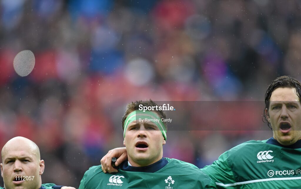 13 February 2016; Ireland's, from left, Richard Strauss, CJ Stander and Mike McCarthy during the National Anthem. RBS Six Nations Rugby Championship, France v Ireland. Stade de France, Saint Denis, Paris, France. Picture credit: Ramsey Cardy / SPORTSFILE