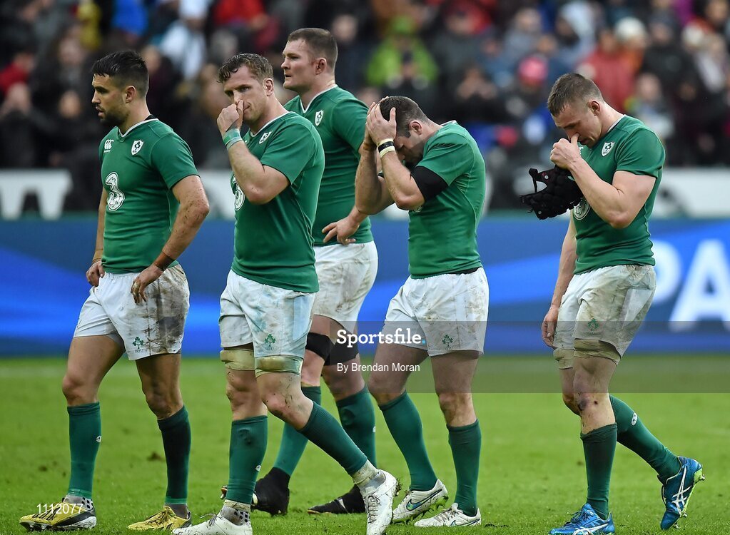 13 February 2016; Dejected Ireland players, from left, Conor Murray, Jamie Heaslip, Donnacha Ryan, Fergus McFadden and Tommy O'Donnell, after the game. RBS Six Nations Rugby Championship, France v Ireland. Stade de France, Saint Denis, Paris, France. Picture credit: Brendan Moran / SPORTSFILE