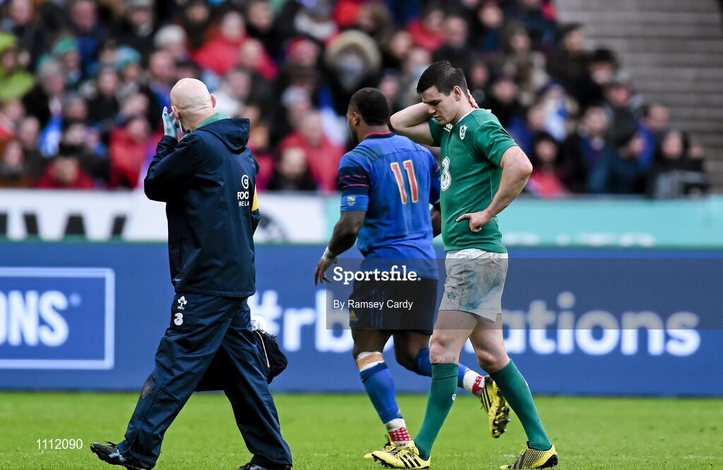 13 February 2016; Ireland's Jonathan Sexton walks off the pitch after picking up an injury. RBS Six Nations Rugby Championship, France v Ireland. Stade de France, Saint Denis, Paris, France. Picture credit: Ramsey Cardy / SPORTSFILE
