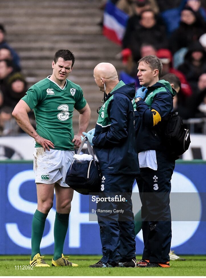 13 February 2016; Ireland's Jonathan Sexton is treated for an injury, before being substituted. RBS Six Nations Rugby Championship, France v Ireland. Stade de France, Saint Denis, Paris, France. Picture credit: Ramsey Cardy / SPORTSFILE