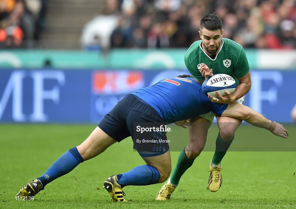 13 February 2016; Conor Murray, Ireland, is tackled by Guilhem Guirado, France. RBS Six Nations Rugby Championship, France v Ireland. Stade de France, Saint Denis, Paris, France. Picture credit: Brendan Moran / SPORTSFILE