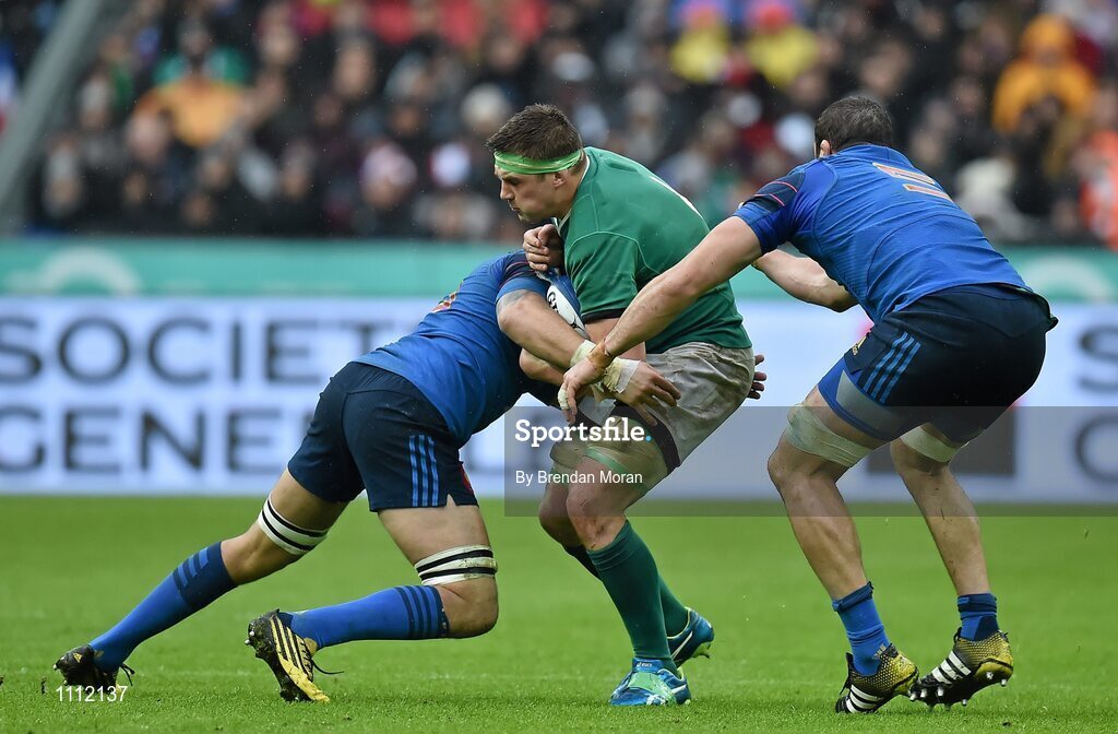 13 February 2016; CJ Stander, Ireland, is tackled by Damien Chouly, left, and Yoann Maestri, France. RBS Six Nations Rugby Championship, France v Ireland. Stade de France, Saint Denis, Paris, France. Picture credit: Brendan Moran / SPORTSFILE