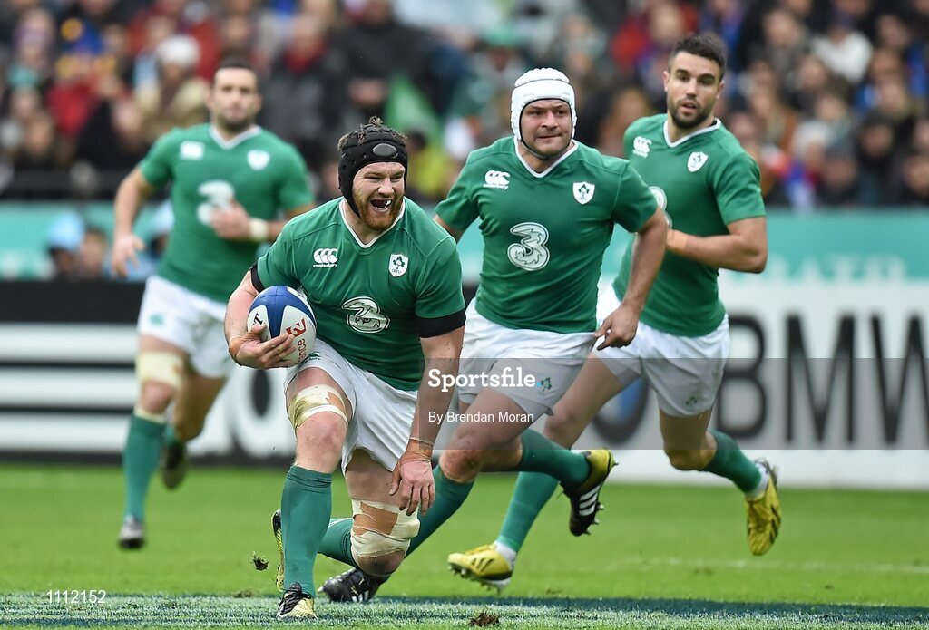 13 February 2016; Sean O'Brien, Ireland, reacts after suffering from a suspected knee injury before leaving the pitch during the first half. RBS Six Nations Rugby Championship, France v Ireland. Stade de France, Saint Denis, Paris, France. Picture credit: Brendan Moran / SPORTSFILE