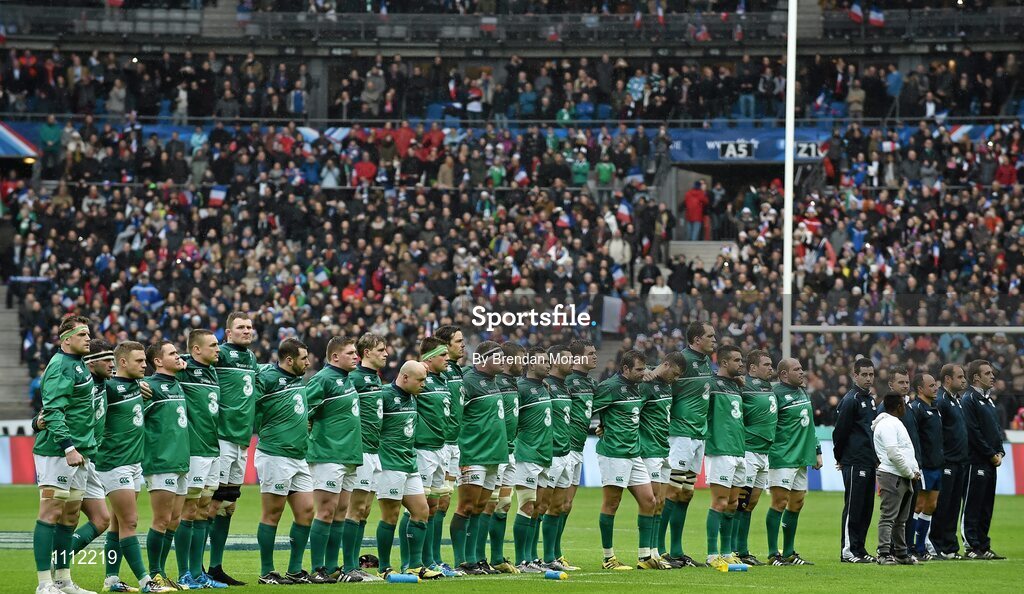 13 February 2016; The Ireland team line up for the national anthems ahead of the game. RBS Six Nations Rugby Championship, France v Ireland. Stade de France, Saint Denis, Paris, France. Picture credit: Brendan Moran / SPORTSFILE