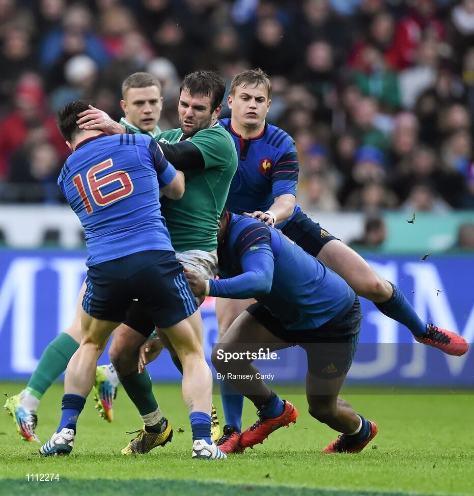 13 February 2016; Jared Payne, Ireland, is tackled by Camille Chat, France. RBS Six Nations Rugby Championship, France v Ireland. Stade de France, Saint Denis, Paris, France. Picture credit: Ramsey Cardy / SPORTSFILE