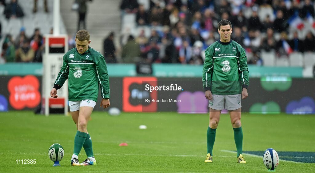 13 February 2016; Ireland's Ian Madigan, left, and Jonathan Sexton prepare to take practice kicks at goal before the game. RBS Six Nations Rugby Championship, France v Ireland. Stade de France, Saint Denis, Paris, France. Picture credit: Brendan Moran / SPORTSFILE