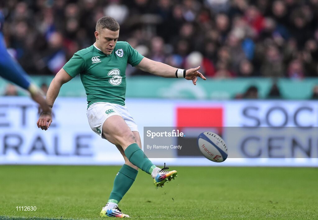 13 February 2016; Ian Madigan, Ireland, kicks a restart, which went directly out of play. RBS Six Nations Rugby Championship, France v Ireland. Stade de France, Saint Denis, Paris, France. Picture credit: Ramsey Cardy / SPORTSFILE