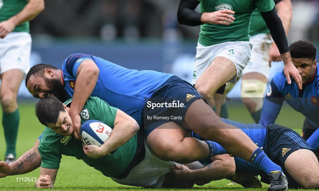 13 February 2016; Jonathan Sexton, Ireland, is tackled by Uini Atonio, France. RBS Six Nations Rugby Championship, France v Ireland. Stade de France, Saint Denis, Paris, France. Picture credit: Ramsey Cardy / SPORTSFILE
