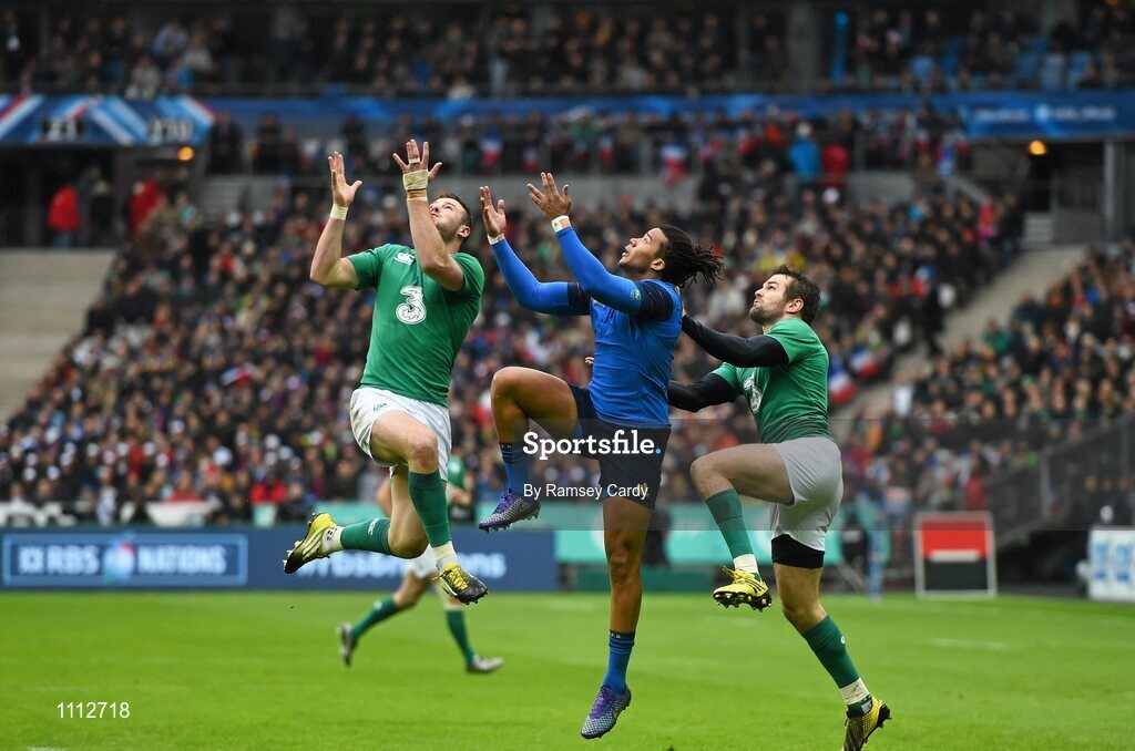13 February 2016; Teddy Thomas, France, in action against Robbie Henshaw, left, and Jared Payne, Ireland. RBS Six Nations Rugby Championship, France v Ireland. Stade de France, Saint Denis, Paris, France. Picture credit: Ramsey Cardy / SPORTSFILE