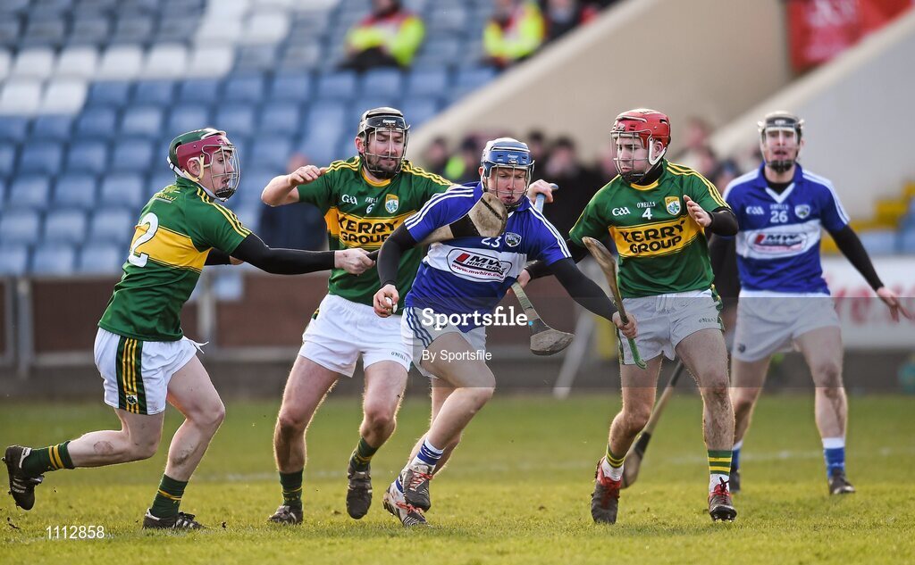 14 February 2016; Mark Kavanagh, Laois, in action against Sean Weir, left, Darren Dineen, and Keith Carmody, right, Kerry. Allianz Hurling League, Division 1B, Round 1, Laois v Kerry. O'Moore Park, Portlaoise, Co. Laois. Photo by Sportsfile