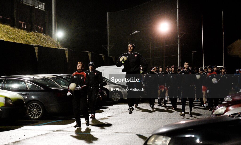 6 February 2016; The Derry squad make their way back to the dressing rooms after warming up on the training pitch before the game. Allianz Football League, Division 2, Round 2, Cavan v Derry. Kingspan Breffni Park, Cavan. Picture credit: Piaras Ó Mídheach / SPORTSFILE