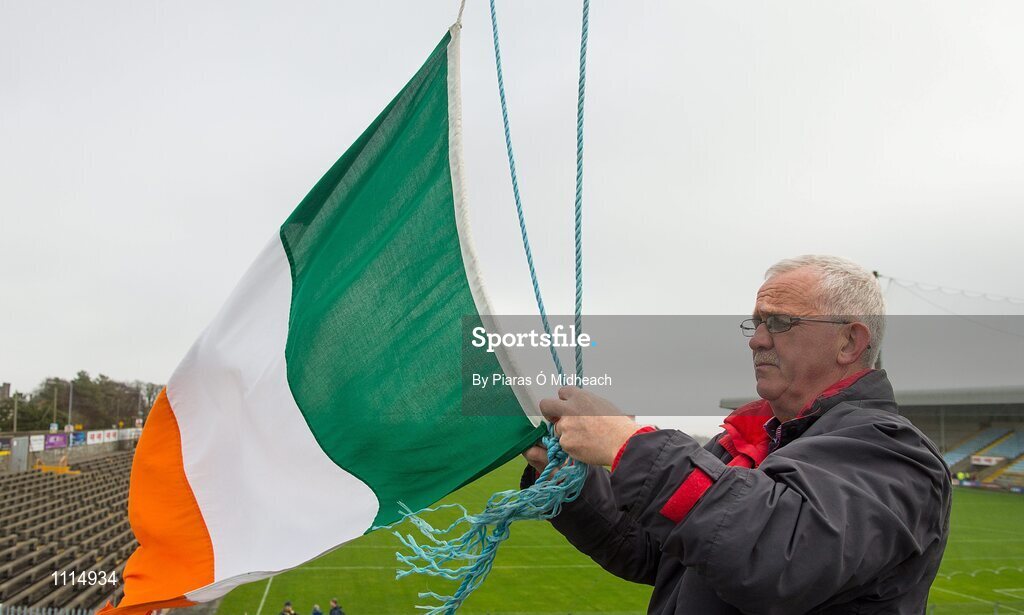 21 February 2016; John Nolan, Innovate Wexford Park groundsman, and father of Irish boxer Adam Nolan raises the tricolour ahead of the game. Allianz Hurling League, Division 1B, Round 2, Wexford v Clare. Innovate Wexford Park, Wexford. Picture credit: Piaras Ó Mídheach / SPORTSFILE