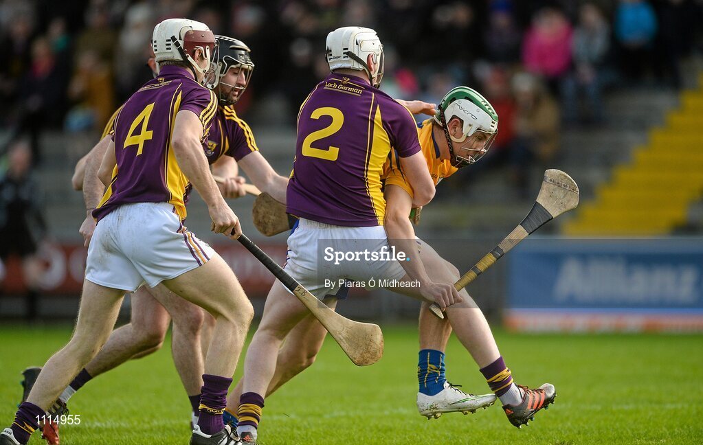21 February 2016; Aaron Shanagher, Clare, in action against Wexford's, from left, James Breen, Eoin Moore, and Liam Ryan. Allianz Hurling League, Division 1B, Round 2, Wexford v Clare. Innovate Wexford Park, Wexford. Picture credit: Piaras Ó Mídheach / SPORTSFILE
