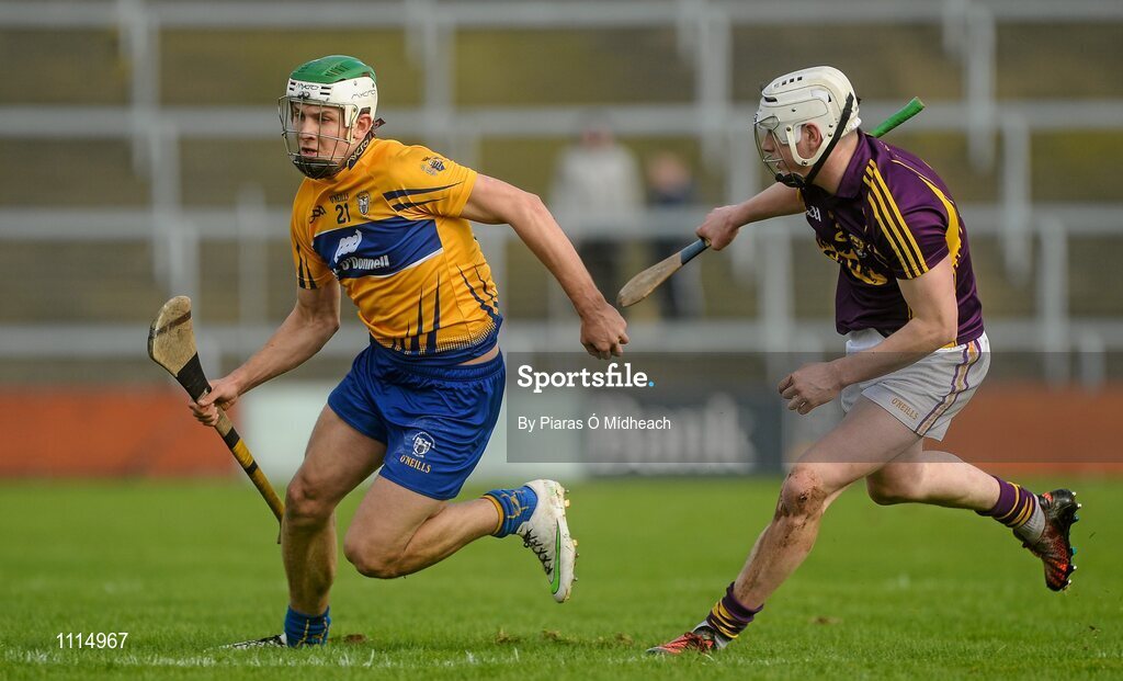 21 February 2016; Aaron Shanagher, Clare, in action against Liam Ryan, Wexford. Allianz Hurling League, Division 1B, Round 2, Wexford v Clare. Innovate Wexford Park, Wexford. Picture credit: Piaras Ó Mídheach / SPORTSFILE