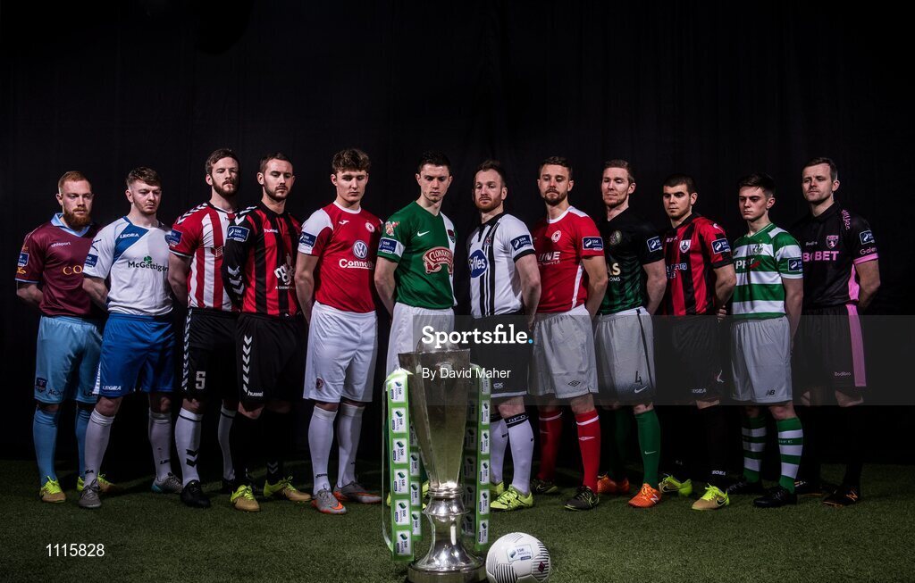 24 February 2016; Players from each of the SSE Airtricity League Premier division teams are, from left Ryan Connolly, Galway United, Adam Hanlon, Finn Harps, Ryan McBride, Derry City, Kurtis Byrne, Bohemians, Kieran Saddlier, Sligo Rovers, John Dunleavy, Cork City, Stephen O'Donnell, Dundalk, Ger O'Brien, St. Patrick's Athletic, Conor Kenna, Bray Wanderers, Conor Powell, Longford Town, Harry Cornally, Shamrock Rovers, and Graham Doyle, Wexford Youths FC, during the launch of the 2016 SSE Airtricity League. Aviva Stadium, Dublin. Picture credit: David Maher / SPORTSFILE