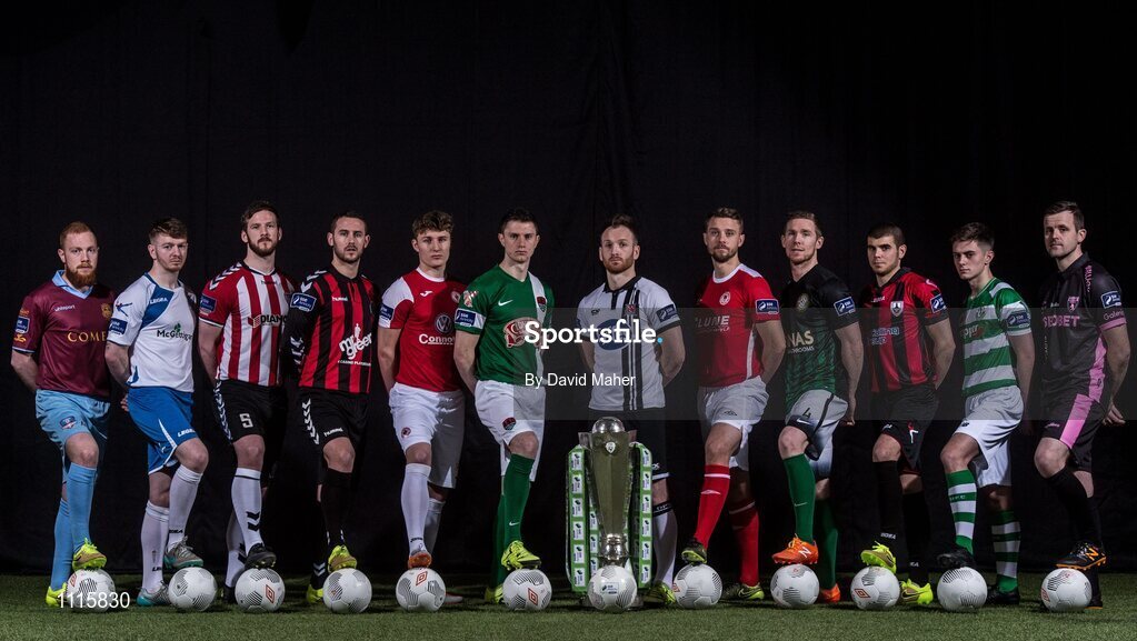 24 February 2016; Players from each of the SSE Airtricity League Premier division teams are, from left Ryan Connolly, Galway United, Adam Hanlon, Finn Harps, Ryan McBride, Derry City, Kurtis Byrne, Bohemians, Kieran Saddlier, Sligo Rovers, John Dunleavy, Cork City, Stephen O'Donnell, Dundalk, Ger O'Brien, St. Patrick's Athletic, Conor Kenna, Bray Wanderers, Conor Powell, Longford Town, Harry Cornally, Shamrock Rovers, and Graham Doyle, Wexford Youths FC, during the launch of the 2016 SSE Airtricity League. Aviva Stadium, Dublin. Picture credit: David Maher / SPORTSFILE