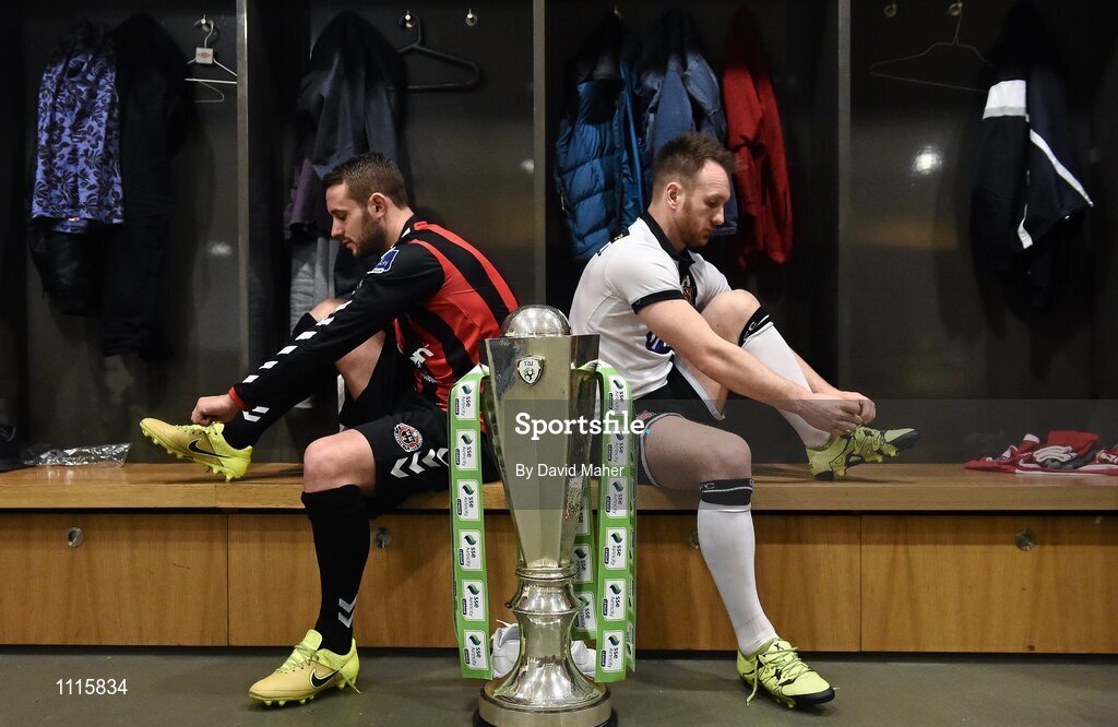 24 February 2016; Kurtis Byrne, left, Boheminans FC, and Stephen O'Donnell, Dundalk FC, at the launch of the 2016 SSE Airtricity League. Aviva Stadium, Dublin. Picture credit: David Maher / SPORTSFILE