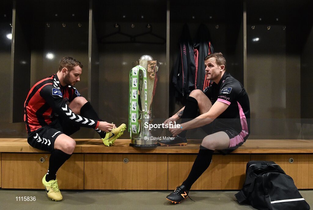 24 February 2016; Kurtis Byrne, left, Boheminans FC, and Graham Doyle, Wexford Youths FC, at the launch of the 2016 SSE Airtricity League. Aviva Stadium, Dublin. Picture credit: David Maher / SPORTSFILE
