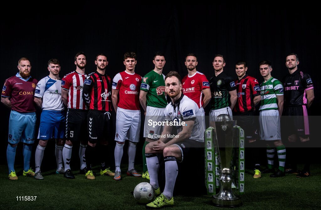 24 February 2016; Players from each of the SSE Airtricity League Premier division teams are, from left Ryan Connolly, Galway United, Adam Hanlon, Finn Harps, Ryan McBride, Derry City, Kurtis Byrne, Bohemians, Kieran Saddlier, Sligo Rovers, John Dunleavy, Cork City, Stephen O'Donnell, Dundalk, Ger O'Brien, St. Patrick's Athletic, Conor Kenna, Bray Wanderers, Conor Powell, Longford Town, Harry Cornally, Shamrock Rovers, and Graham Doyle, Wexford Youths FC, during the launch of the 2016 SSE Airtricity League. Aviva Stadium, Dublin. Picture credit: David Maher / SPORTSFILE