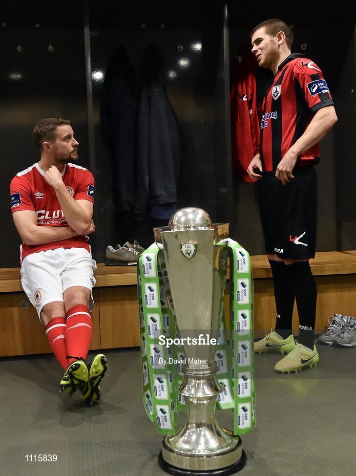 24 February 2016; Ger O'Brien, left, St. Patrick's Athletic, and Conor Powell, Longford Town, at the launch of the 2016 SSE Airtricity League. Aviva Stadium, Dublin. Picture credit: David Maher / SPORTSFILE